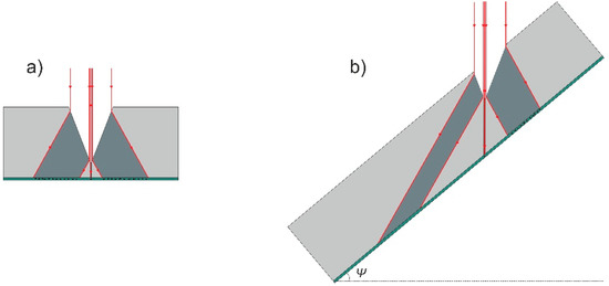 In case the polarization selection is not sufficient to prevent damage in the coating, the “dead zone” in the backside coating along both sides of the scan line can be reduced by orienting a substrate at an angle to the plane, which contains the scanned laser beam. In Figure 6 this is illustrated by comparing two cases: when the substrate is perpendicular to the laser beam (Ψ = 0°; Figure 6a) and when the substrate is rotated so that the angle between the substrate and the beam scanning plane is 40° (Ψ = 40°; Figure 6b). The crater is shown as a triangle shape due to its simplicity. The rays, showing the laser radiation, propagates to the crater wall and are refracted, according to the Snell’s law. In the case of Ψ = 0° zones containing the refracted radiation and reaching the backside coating are formed on both sides of the crater. In the case of Ψ = 40° at one side refracted radiation is contained very near the ablation channel, and on the other side propagates into the substrate at a shallow angle, resulting in both losses due to the absorption in the substrate material and in a widening of the zone at which radiation reaches the backside coating, so reducing the probability to damage it.