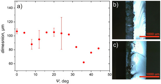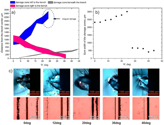 In Figure 7a, experimentally obtained dependence of the distance from the ablation trench to the damage zones at both sides of the cut line on the angle between the substrate and the beam scanning plane Ψ is shown. When Ψ = 0°, two damage zones on both sides of the ablation plane are formed at approximately 1000 µm distance from the beam scanning plane. While Ψ increases to about 20°, both of these damage zones remain present, although the damage zone on left-hand side becomes weaker, reduced to the isolated islands of damaged or removed coating. Also, all damage zones shift to the left from the cut line resulting in a moderate increase of the sum damage zone width (Figure 7b). At the same time, an increase of the Ψ results in the formation of damage area, caused by irradiation transmitted straight through the substrate, not directly beneath the cut line, but at some distance from it due to the substrate orientation. When Ψ is further increased the damage zone at the left-hand side becomes even weaker (Figure 7c) and completely disappears at angles equal or larger than 28°, resulting in a sharp drop of the sum damage zone width from 3000 µm to less than 750 µm. When 28° ≤ Ψ ≤ 44°, a slight decrease of the sum damage zone width can be observed (Figure 7b), caused by the right damage zone moving beneath the channel, and impeded by the increasing width and distance from the cut line of the damage zone caused by irradiation transmitted straight through the substrate (Figure 7a,c).
