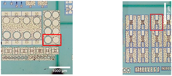 Microscope images of the transparent SiC wafer with AlGaN/GaN heterostructures and electronic devices being in a focus and laser ablated trenches being on the back side. Red color rectangles indicate selected devices for investigations: Schottky barrier diodes (left) and High-electron mobility transistor (right). Note that the trench line was made directly under one of the diodes. Scale bar is 1000 μm.