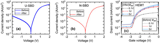 Current-voltage (I-V) characteristics of Schottky barrier diodes (SBDs) (a,b) and high-electron-mobility transistors (HEMT) (c) located under (a) and near (approximately 250 μm away) the trenches (b,c) formed in the back side of the substrate by laser microfabrication. The samples were characterized before and after the trenches were processed on the back side of SiC wafer in a depth of 270 µm.