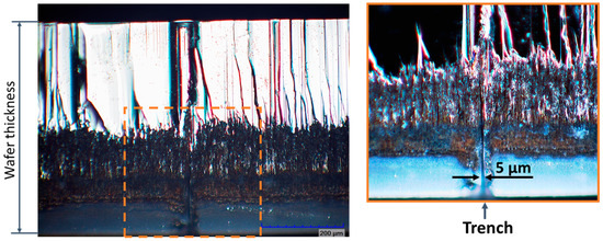 Finally, the laser ablation process was optimized and used to dice transparent wafers with AlGaN/GaN heterostructures with various electronic devices. Before laser processing, some of Schottky barrier diodes (SBDs) and High-electron-mobility transistors (HEMTs) were selected for detailed investigation by measuring the I–V characteristics in the EPS150 probe station (Cascade Microtech, Beaverton, OR, USA) equipped with the source-measure-unit SMU Keithley 2400 (Tektronix, Beaverton, OR, USA). Selected devices are indicated by red color rectangle in Figure 9 and their respective electrical characteristics before the processing are shown in Figure 10 by solid lines. Visible trenches appeared after the laser ablation on the back side and are seen in Figure 9 due to the transparency of the substrate. Using the optimized processing parameters, no visible damage to the AlGaN/GaN heterostructures was observed along the ablation lines (see Figure 9). The Schottky barrier diodes (SBDs) used for investigation are indicated by red color rectangle. The depth of the trench was found to be about 270 μm, as it is shown in Figure 11 (right), and the width at the top was found to be about 30 μm with obvious reduction down to a few microns at the maximum depths.