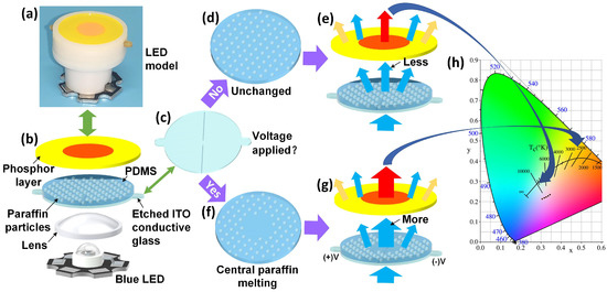 Figure 1 showed the schematic diagram of the CCT-modulation white LED module and its work principle. The white LED with tunable CCT with single-chip was mainly composed of an indium tin oxide (ITO) conductive glass, paraffin-PDMS film, and a patterned phosphor layer. The peak wavelength of the blue LED chip was 460–470 nm and the chip was fixed on an aluminum substrate. An optical lens was mounted above the chip for regulating the blue light emitted from the chip to transmit within 15° angular angles, as shown in Figure 1b. The paraffin-PDMS film was placed on the ITO glass. The distance between the ITO glass and the LED chip was 12 mm. The patterned phosphor layer in which the red phosphor was with the diameter of 12 mm and yellow phosphor had the inner diameter of 12 mm, and the outer diameter of 32 mm was placed above the paraffine-PDMS film. And their gap was set as 2 mm.