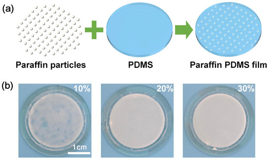 (a) Schematic of fabrication of a paraffin-PDMS film. (b) Picture of paraffin-PDMS films with concentrations, 10%, 20%, and 30%.
