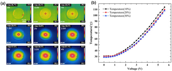 (a) Infrared thermal images of film surfaces under different voltages. (b) Variation curve of film center temperature with voltage.