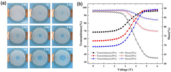 (a) Pictures of films with melting centers. (b) Transmittance and haze of paraffin-PDMS films with different concentrations changed with voltage.