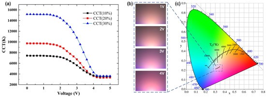 To realize the real-time adjustment of the CCT, several methods have been proposed. The simplest way is to arrange two or three different color LED chips and adjust the CCT by changing the mixing ratio of different lights, but it requires a complicated control circuit, and is also restricted by uniformity of the color spaces [17,18,19,20,21]. Quantum dot materials are used to adjust the CCT, such as changing the volume ratio of different color quantum dot materials and introducing a dynamic color filter. However, the heat generated during chip operation will result in a decrease in the luminous efficiency and light conversion efficiency of the quantum dot material after being heated [22,23,24]. Moreover, the liquid crystal (LC) technology is combined with LED to realize CCT adjustment through a color conversion film, but the adjustable range of CCT is limited to only 2500 K [25,26]. Therefore, a simple, wide range and real-time CCT regulation method of LEDs is still needed.