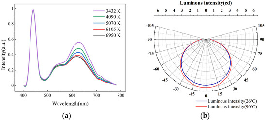 As shown in Figure 6a, the electroluminescence spectra further demonstrated the regulation process of the CCT. As the proportion of red wavelengths increased, the CCT of LED decreased significantly. The LED distribution curve was tested, as shown in Figure 6b. The luminous intensity with the center temperature of 90 °C in the paraffin-PDMS was higher than that at 26 °C and the maximum difference was 0.308 cd. The smaller the absolute value of the angle, the greater the difference of luminous intensity, which was due to the change of transmittance and haze in the center of the film. This method could simulate natural light well. By adjusting the parameters, the LED could achieve high luminous intensity and CCT from 9:00 to 15:00, about 6500 K. At sunrise and sunset, the LED had lower light intensity and CCT, about 3500 K.