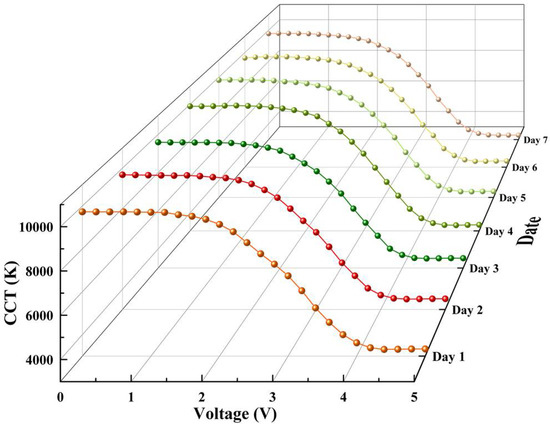 To verify the stability of CCT adjustment, the CCT of LED was tested within one week, as shown in Figure 7. The CCT fluctuated in a certain range, and the maximum difference was 536 K at the same voltage of ITO glass. The difference was small, which could meet the requirements of normal operation. This experiment had good stability and reliability for CCT adjustment of white LEDs. The luminous efficiency of the LED calculated by measured lumen value and power consumption of LED chips was 29.08 lm/W at the CCT of 6500 K, and that without the paraffine-PDMS film was 55.32 lm/w. The power to adjust the CCT was analyzed. The maximum voltage was 4.6 V, and the current was 0.11 A. In other words, the maximum power to adjust the CCT was only 0.506 W. Taking it into account the entire power, the LED luminous efficiency was 24.93 lm/W. The efficiency loss was due to the scattering effect of the paraffin particles in the paraffin-PDMS film. The luminous efficiency could be further improved by improving the process, such as changing the diameter of paraffin particles, changing the smoothness of paraffin particles, and changing the thickness of the film. In this works, we mainly demonstrated the principle of CCT modulation. In future work, we will further optimize the process to improve luminous efficiency.
