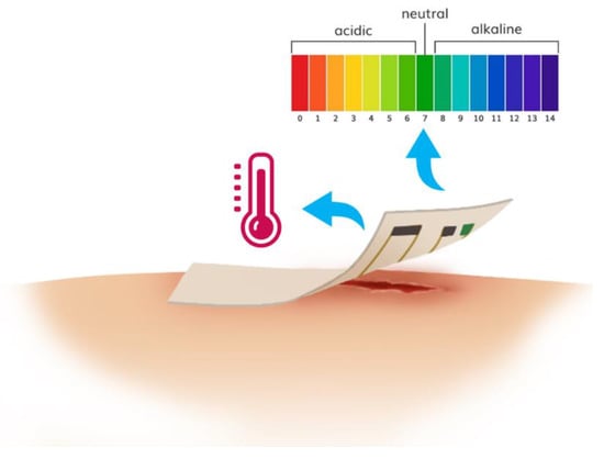 Our skin is important in protecting internal organs from external environmental hazards [1]. However, in some cases, it may be subject to injuries, such as cuts, abrasions, blisters, burns, stab wounds, etc. Generally, current treatment of skin wounds is simply to place a bandage or medical gauze to prevent the wounds from being infected by infectious microorganisms (e.g., pathogens) [2,3,4]. In clinical practice, the assessment and monitoring of wound status are usually based on visual evaluation of variables (e.g., the color of the wound bed, the amount of exudate) [5]. However, this subjective observation can lead to inconsistencies due to changes in illumination and angles. Meanwhile, these assessments require frequent removal of wound dressing, which will not only waste clinical resources but also interrupt the normal wound healing process, causing a second injury to the wound and pain to the patients [6,7,8]. Therefore, providing some useful real-time information related to the state of wound healing to eliminate the time lag and avoid the formation of chronic wounds is crucial for clinicians to conduct clinical care and make appropriate treatment decisions.