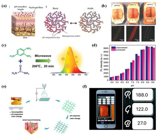 (a) Schematic illustration of alginate-based hydrogel microfibers loaded with pH-responsive beads (i) and the action mechanism of solid matrix of the mesoporous particles (ii); (b) the wound dressings fabricated by hydrogel microfibers response to different pH (Reprinted with permission from [51]); (c) synthesis of orange-emissive carbon quantum dots (O-CDs); (d) comparison of photoluminescence intensities of O-CDs on medical cotton cloth (MCC) before and after immersion in phosphate-buffered saline (PBS) buffers with different pH (Reprinted with permission from [52]); (e) fabrication process of curcumin-loaded fibers used for wound pH detection; (f) RGB (red, green, blue) values of polymer fibers after pH detection were determined by smartphone (Reprinted with permission from [36]).