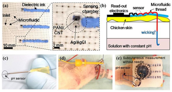 (a) Optical images of conductive thread-based pH sensor array; (b) mechanism of microfluidic pH sensor in skin wound pH detection; (c) the thread-based pH sensor passed through a normal needle; images of the thread-based pH sensor used for (d) stomach and (e) subcutaneous pH sensing (Reprinted from [58]).