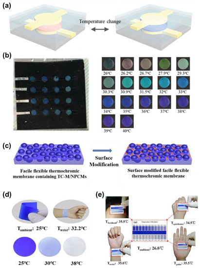 In order to make up for the above defects in traditional infrared sensors, wearable sensors with the ability of temperature visualization offers a promising approach with in-situ monitoring of temperature change and real-time diagnosis of the health status by seamless contact with human skin [82]. Thermochromic materials that change color with temperature changes have been widely studied and used in human healthcare [83,84]. Hemant et al., introduced a bimodal sensor array which was fabricated by a feasible method to detect the changes in temperature and pressure in a visible way [85]. As shown in Figure 5a, the elastic composite material containing thermochromic dyes is sandwiched by the stretchable electrode of an amphoteric electrolyte hydrogel to realize the bimodal functions of thermochromic and tactile sensing. Colorimetric responses to different temperatures are shown in Figure 5b, which indicates the good sensitivity of the elastic composite material. In order to quantify the performance of the material, digital image processing was used by identifying particular temperatures based on the hue (in the hue saturation value space of Figure 5b). From the temperature-hue relationship, the temperature can be quantified with an uncertainty value of ~0.1 °C between 26 and 34 °C, and uncertainty was deteriorated close to 0.4 °C near 40 °C. To optimize the accuracy of the colorimetric temperature detection, He et al. fabricated a reversible thermochromic membrane by burying thermochromic microcapsules inside the polyvinyl alcohol/polyurethane (Figure 5c) [86]. The thermochromic membrane exhibited a dual functional feature of effective temperature adjustment and reversible thermal indication (Figure 5d,e). Therefore, this type of membrane has great potential as a wearable temperature for human healthcare monitoring.