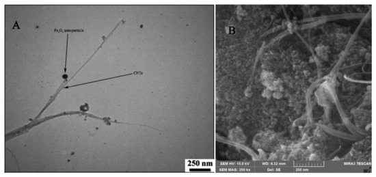 (A) Transmission electron microscope (TEM) and (B) field-emission scanning electron microscope (FESEM) images of Fe3O4-SWCNTs nanocomposite.