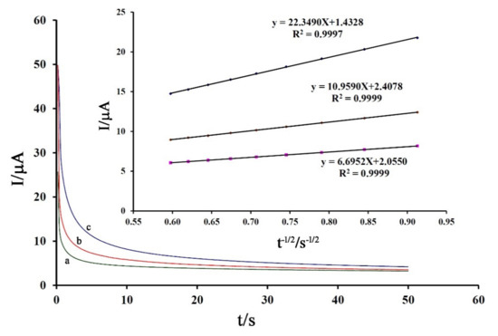 After confirmation of the diffusion process for electro-oxidation of the drug, the diffusion coefficient (D) was obtained by chronoamperometric studies with an applied potential of 750 mV in the presence of 300 μM, 400 μM, and 500 μM of DA (Figure 5). Using recorded Cottrell’s plots and related slopes, the value of the diffusion coefficient was calculated to be about 3.57 × 10−6 cm2/s (Figure 5 inset).
