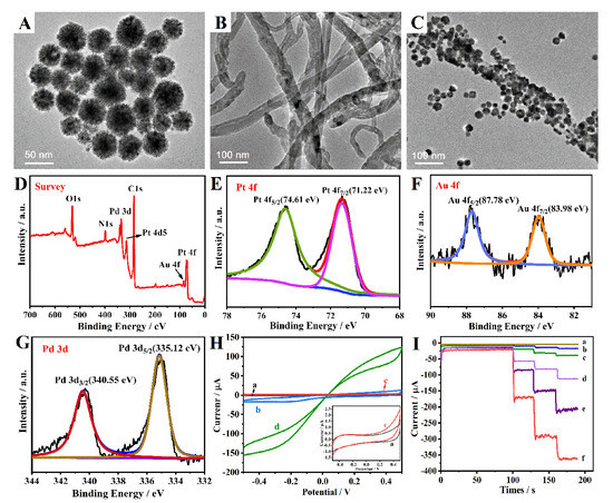 Transmission electron microscopy (TEM) images of (A) AuPdPt, (B) multi-walled carbon nanotubes (MWCNTs), (C) MWCNTs–AuPdPt; (D) X-ray photoelectron spectroscopy (XPS) spectrum of MWCNTs–AuPdPt, high-resolution XPS of (E) Pt 4f, (F) Au 4f, and (G) Pd 3d of the MWCNTs-AuPdPt; (H) cyclic voltammetry (CV) curves of (a) glassy carbon electrodes (GCE) and (b) GCE/MWCNTs-AuPdPt in Phosphate-buffered saline (PBS) solution, and (c) GCE and (d) GCE/MWCNTs–AuPdPt in PBS solution containing 10 mM H2O2; (I) Ameperometic responses of different modified electrodes for the successive addition of 10 mM H2O2 in PBS solution: (a) GCE, (b) GCE/MWCNTs, (c) GCE/Au, (d) GCE/AuPd, (e) GCE/AuPdPt, and (f) GCE/MWCNTs-AuPdPt. Inset in Figure 1H: the enlarged CVs of curve (a) and (c).