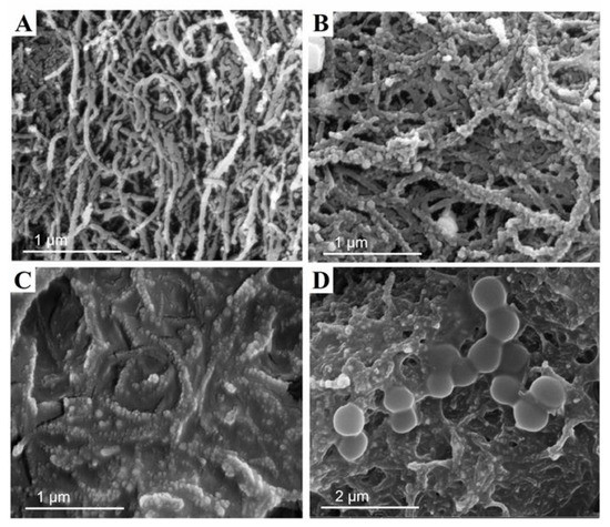 Scanning electron microscopy (SEM) images of (A) MWCNTs, (B) MWCNTs-AuPdPt, (C) MWCNTs-AuPdPt/Anti-S. aureus antibody (Ab), and (D) MWCNTs-AuPdPt/Ab/Staphylococcus aureus (S. aureus).