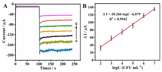(A) Ameperometic current responses of immunosensor for the detection of different concentrations of S. aureus from a to f (0, 1.1 × 102, 1.1 × 103, 1.1 × 104, 1.1 × 105, 1.1 × 106, 1.1 × 107 CFU mL−1) in 0.1 M PBS containing 20 mM H2O2 at −0.4 V, and (B) plots of ΔI values vs. logarithm value of the concentrations of S. aureus.