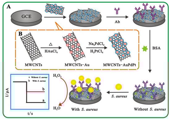 Schematic description of (A) the fabrication of the electrochemical immunosensor for detection of Staphylococcus aureus (S. aureus), and (B) the preparation procedure of multi-walled carbon nanotubes (MWCNTs)-AuPdPt.