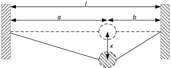 Nonlinear resonant geometries have been of particular interest for both physicists and mechanical engineers. In the case of a MEMS designer, the use of such previously characterized geometric nonlinearity will allow for the control of the nonlinear behavior of the MEMS device. Among these structures, some are particularly interesting, since they can naturally exhibit either a softening or a hardening response. The weighted string is such a system. Depending on its initial parameters, it is capable of exhibiting either spring softening or spring hardening, or even a linear response []. This system is comprised of string of a half-length with a weight of a mass m located at distance a from one anchor and b from the other anchor. x denotes the displacement of the mass. Such a system is shown in Figure 1. To analytically describe this behavior, an approximation of the governing nonlinear differential equation is given by []: