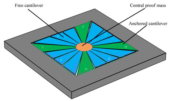 Illustration of one of the available anchoring schemes of the squared daisy MEMS resonator. In this anchoring scheme, the cantilevers 3, 7, 11, and 15 are anchored and shown in green, while the others are free and shown in blue.