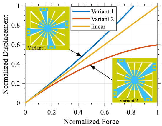 As a result of this process, two SD variants have been defined. The parameters used to describe these variants are presented in Table 1. These parameters have been carefully chosen to simulate MEMS devices fabricated using the PiezoMUMPs micro-fabrication process. The results of the simulation of the behavior of such variants, under different loads, are shown in Figure 3. Consequently, it has been shown that the SD structure has the potential to exhibit either softening or hardening behavior depending on its anchoring scheme, since such an anchoring scheme effectively changes the behavior of spring in the presence of a large-enough displacement.