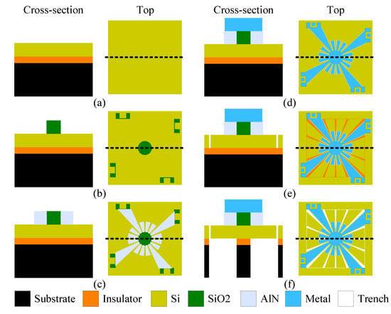 To experimentally validate and study the effects of nonlinearity on the SD structure, the variants previously presented were fabricated. In this section, the PiezoMUMPs’ micro-fabrication process to prototype the MEMS resonators described in Section 3.1 is described. This process provides cost-effective access to piezoelectric MEMS prototyping. In the literature, this process has been reported for the implementation of various MEMS-based resonators and VEH (e.g., [,,,,,]). The fabrication process includes five masks based on an N-type, double-sided, polished silicon-on-insulator (SOI) wafer. In the first step, a 10 -thick silicon (Si) layer in the (001) orientation (Figure 4a) is doped in order to increase its electrical conductivity for use as a bottom electrode. Thereafter, an insulating -thick layer of silicon dioxide is grown and patterned on the SOI wafer (Figure 4b). A -thick piezoelectric layer of aluminum nitride (AlN) is then deposited and patterned (Figure 4c). In the next step, a layer of metal is deposited, consisting of a stack of 20 -thick chromium (Cr) and of 1 -thick aluminum (Al). This layer is used as the top electrode (Figure 4d). The silicon device layer is then patterned to create the suspended structure (Figure 4e). Then, the 400 substrate is etched from the backside of the wafer to form the trench below the structure to release it (Figure 4f). It is worth noting that this process allows for the use of the suspended substrate to be used as a proof mass. Accordingly, in the case of the SD structure, the trench step also frees the proof mass to enable it to vibrate. Upon reception of the device from the foundry, no post-processing step has to be applied to the manufactured devices. Complementary information regarding the fabrication process can be found in [].