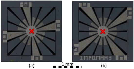 The layouts for both SD resonator variants as defined in Table 1 were implemented. The fabricated resonators occupy a total silicon area of 1700 by 1700 , and are shown in Figure 5. In this figure, the proposed anchoring schemes and the point used for the vibration measurement are shown.