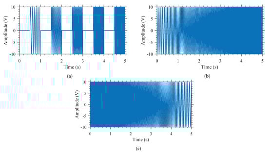 An illustration of the excitation signal for the and is shown in Figure 7b,c, respectively. With reference to this figure, the amplitude of the excitation signal is 20 . The lower and higher frequencies are 10 and 50 , respectively. The excitation duration is .