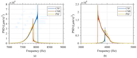 Influence of the excitation signal type (CSF, CSB, or PSF) on the frequency behavior when the amplitude of the excitation signal is 20V (a) Variant 1 and (b) Variant 2.