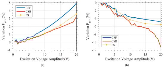 Influence of the amplitude and type of the excitation (CSF, CSB, or PSF) on Fmv of (a) Variant 1 and (b) Variant 2.