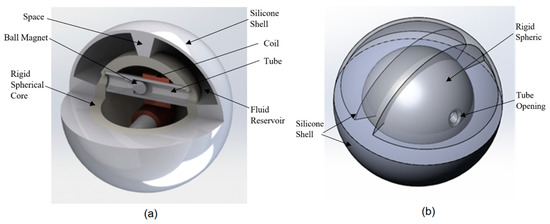 The rigid spherical core is enclosed within a silicone shell. A fluid reservoir is formed in the gap between the inner surface of the shell and the outer surface of the rigid spherical core. This distance was designed to be 12.0 mm in order to deliver enough displacement of the fluid in the reservoir to effect movement of the ball magnet when the outer surface of the shell is exerted upon by a flat surface. The outer and inner diameters of the shell are 76.2 and 73 mm, respectively, giving it a wall thickness of 1.6 mm which is optimal for the flexibility of fluid flow while maintaining durability from potential impact. As shown in Figure 1b, half of the shell is separated from the other half by a silicone spacer and each half is split equally with a center silicone rib of 5.1 mm chamfered up to 11.7 mm, allowing fluid flow only through the tube associated with that half. With this configuration, the shell reservoir is split to four regions. The overall size of the ball, as well as the dimensions of features, were selected based on the feasibility restrictions.