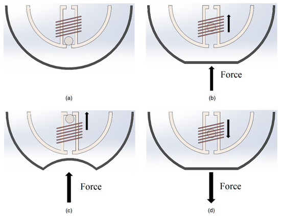 The working principle of the device is illustrated in Figure 2. The ball magnet initially falls in the bottom of the tube due to gravity (Figure 2a). When the outer surface of the harvester shell is pressed due to any external force, the reservoir is compressed displacing the fluid through the tube and pushing the ball magnet through the coil (Figure 2b,c). This movement of the ball magnet relative to the coil causes a change in the coil magnetic flux, inducing a voltage in the coil according to Faraday’s law of electromagnetism. When a magnet with its north to south axis aligned with the longitudinal axis of the coil moves though the coil, an emf voltage is generated in the coil due to magnetic induction.