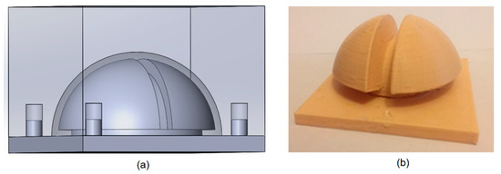 (a) SolidWorks model of the shell mold. (b) 3D printed mold used to fabricate two similar halves of the silicone shell.