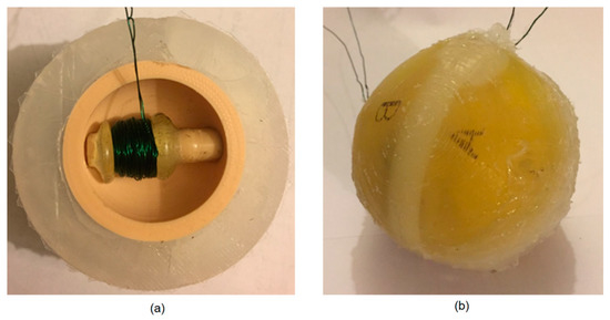 The tube inside the rigid spherical core was wrapped with a 0.4 mm diameter wire to form a 200 turn, 12 mm long coil exactly in the middle portion, where the magnetic ball would travel. With the magnet inserted into the tube, it was then secured and sealed into the internal opening of the rigid spherical core using the silicone epoxy. One of the halves of the silicone shell was attached to the rigid spherical core using the silicone epoxy. The assembled half of the harvester body is illustrated in Figure 4a.