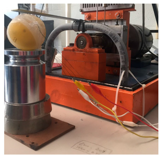 The energy harvester and its fabrication accessories were designed using SOLIDWORKS. The model of the device and its internal features are shown in Figure 1a. The device has a rigid spherical core 50 mm diameter made of Polylactic Acid (PLA) material consisting of two similar bonded halves. This diameter was selected as an optimum one. It should be large enough to ensure that there will be enough contact surface between the shell and external object (e.g., ground) and so enough fluid available to push the ball magnet through the coil while it should small enough to be movable. As shown in Figure 1a, each spherical half has a 5.1 mm diameter opening to allow for fluid flow into a tube. Each half encloses a tube with a 200-turn solenoid coil wound over the tube. The tube measures 10.2 mm in outer diameter and an inner diameter of 7.4 mm, giving a 6.4 mm diameter permanently magnetized ball enough tolerance to freely move through the tube. This magnet size was selected to ensure that it can generate enough induction in the coil while it is still light enough to avoid any resistance against fluid movement. The wall of the tube has a maximum thickness of 1.4 mm to ensure the coil is as close to the magnet as possible to produce the highest voltage for this size application. The tube also has a check spacer placed 26.0 mm in from its opening to allow fluid flow but to stop the ball from moving past the coil. This allows for the magnet to travel as much as 19.6 mm.