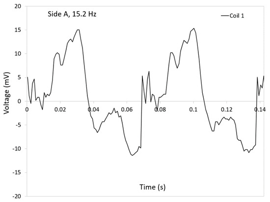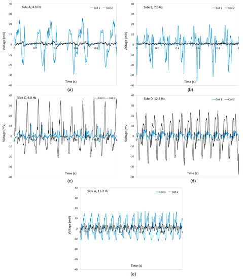 When comparing the voltages in side A at 4.3 Hz (Figure 6a) with the ones in the same side at 15.2 Hz (Figure 6e), it is clear that the amplitude of the voltages in the main coil 1 slightly decreased. On the other hand, the voltages induced in coil 2 increased at 15.2 Hz. This effect in coil 2 could be due to the fact that the orientation of coil 2 affects the high speed of the fluid on the ball magnet while the speed of the fluid at low frequencies is not high enough to be able to move the ball magnet efficiently in an inclined coil 2.