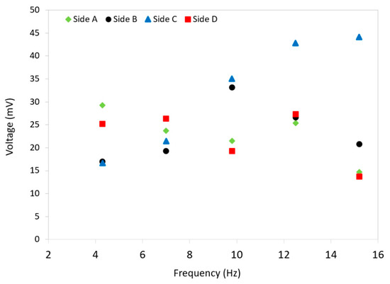 A comparison between the peak voltage amplitudes of all four sides of the harvester at different frequencies.