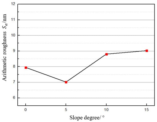 - Under optimal cutting conditions, the optical surface quality, with an arithmetic roughness of 3–4 nm, can be achieved at various slope Degrees. Furthermore, the unevenness of surface finishes at various slope degrees was alleviated in this ultrasonic tooling system with a combination of optimal parameters.