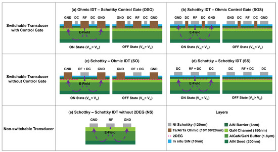 Schematic cross sections of different transducers considered in this work. Switchable transducer with (a) Ohmic–Ohmic IDT and Schottky control gate (OSO), (b) Schottky–Schottky IDT and Ohmic control gate (SOS), (c) Schottky–Ohmic IDT and no control gate (SO), (d) Schottky–Schottky IDT and no control gate (SS). (e) Non-switchable (NS) transducer with Schottky–Schottky IDT and no 2DEG channel.