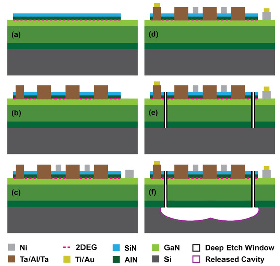 Fabrication process steps of switchable GaN MEMS resonators. (a) Mesa isolation. (b) Ohmic (Ta/Al/Ta) metallization and annealing. (c) Schottky (Ni) metallization. (d) Pad (Ti/Au) metallization. (e) Deep etch. (f) Isotropic release.