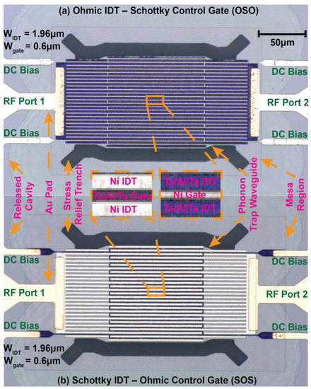 Optical micrographs of two different switchable resonators with Ohmic IDT–Schottky control gate and Schottky IDT–Ohmic control gate are shown in Figure 3. Insets in the figure highlight the different types of IDTs and control gates of the transducers. In both cases, the devices have equal dimensions and numbers of IDTs. Identical phonon trap cavities with a wider active region in the middle and gradual reduction in width at the flanks are used to ensure high-Q resonance [32]. A standing elastic wave is formed in the resonance cavity, while the flanks generate an exponentially decaying evanescent wave to minimize radiative acoustic loss through the substrate [39,40]. The phonon trap design further eliminates the necessity of narrow tether suspensions and the resistive losses they induce. Additionally, a broad region to couple into the cavity improves power handling and linearity through better heat dissipation. Stress relief windows with curved design at the corners are also implemented to avoid fracture and increase device yield during release [5].