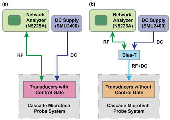 The transducers were measured in a standard two-port configuration at room temperature under vacuum in a probe system (PMC200, Cascade Microtech, Dresden, Germany). A parametric network analyzer (N5225A, Agilent Technologies, Santa Clara, CA, USA) was used to drive −10 dBm input RF signal with 50 Ω termination, and scattering parameters (S-parameters) were extracted. DC bias was applied using source measurement units (SMU2400, Keithley Instruments, Solon, OH, USA) to control the transducers’ 2DEG channel. Measurements included short-open-load-through (SOLT) calibration using a standard calibration substrate to remove parasitics from the cables and probes. On-chip open and short structures were used to de-embed data from raw measurements to eliminate parasitic capacitance and inductance from the probe pads and routing. Two different experimental setups were used to measure switchable transducers, as shown in Figure 4. For the transducers with a control gate (OSO and SOS), RF signal and DC bias were applied to the IDTs and control gates, respectively. For resonators without a control gate (SS and SO), an external bias-T was used to superimpose the RF signal and DC voltage.