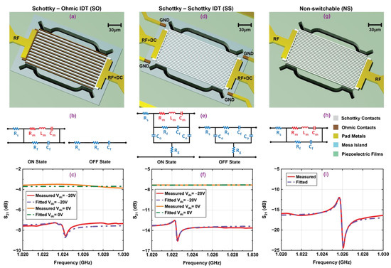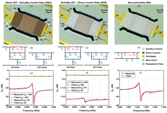 Three-dimensional schematic representation, equivalent circuit models and measured frequency responses along with fitted curves for switchable resonators: (a–c) Ohmic–Ohmic IDT with Schottky control gate (OSO), (d–f) Schottky–Schottky IDT with Ohmic control gate (SOS), and (g–i) non-switchable (NS) transducers. Both OSO and SOS have control gate width 0.6 µm, and all resonators have IDT width and pitch 1.96 µm. The devices were measured under vacuum with −10 dBm input RF power.