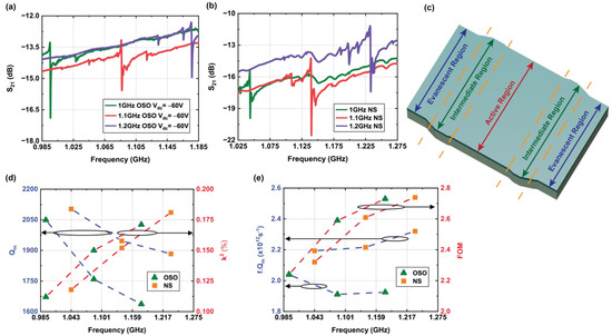 The width and pitch of the IDTs for the resonators are scaled to actuate the S0 Lamb mode at 1, 1.1, 1.2 GHz. All devices share the same number of IDTs and cavity length. A comparison in Qm and k2 with frequency scaling for OSO and NS transducers is shown in Figure 7d. Qm reduces while k2 increases with the frequency for both OSO and NS transducers in a similar trend. Therefore, the f·Qm product remains almost constant, and the FOM increases gradually with the frequency, as presented in Figure 7e.