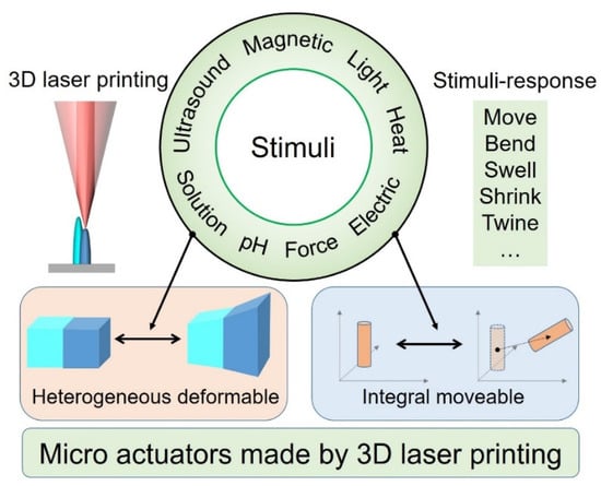 The employment of 3D laser printing for 3D microactuators not only provides a flexible and powerful tool to fabricate new stimulus-responsive devices, but also paves a new path for the design of the operation mechanisms of 3D microactuators. In this review, we discuss the recent progress of stimulus-responsive 3D microactuators fabricated with 3D laser printing depending on different stimuli in Section 2. Then, the outlook of the design, fabrication, control, and application of 3D laser-printed microactuators is propounded in terms of the future focus in Section 3. Lastly, in Section 4, we conclude with current challenges and perspectives about 3D laser-printed microactuators.