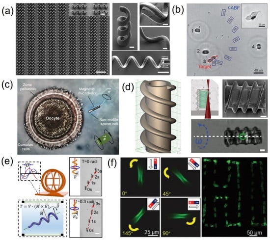 Zhang and Nelson et al. designed and fabricated magnetic helical swimmers using 3D direct laser writing (DLW) and physical vapor deposition (Figure 2a) []. These devices achieved corkscrew motion in a fluid via the relatively high frequency of the rotating field. After demonstrating excellent swimming performance in water and fetal bovine serum (FBS), these helical micromachines were employed to transport microparticles. These helical swimmers can perform 3D navigation in a controllable fashion with micrometer precision in low-strength rotating magnetic fields (<10 mT), and they are promising tools for targeted drug delivery in vitro and in vivo. This strategy is so universal and reliable that a series of research studies were performed following this work. Qiu further improved this approach by functionalizing with lipoplexes to enhance the biocompatibility of these types of helical swimmers. Subsequently, the successful wirelessly targeted single-cell gene delivery to human embryonic kidney (HEK 293) cells using artificial bacterial flagella (ABFs) loaded with plasmid DNA (pDNA) in vitro was demonstrated for the first time (Figure 2b) []. This work presents the possibility of such magnetic swimmers targeting hard-to-reach areas in the human body, since the flagellum-propulsive method is a promising approach in viscous liquid (e.g., blood and interstitial fluid). Similarly, Schmidt’s group customized microhelices to serve as motors for transporting sperm cells with motion deficiencies to help the cells carry out their natural function. They mimicked such motors in in vivo conditions and applied hypoosmotic swelling as a method for sperm selection in a microfluidic channel platform. Although the complete release of the sperm cell after motion was not successful due to the unspecific adhesion of the microhelix (Figure 2c), this magnetic–biological hybrid propulsion exhibited prospects to cure cell diseases [].