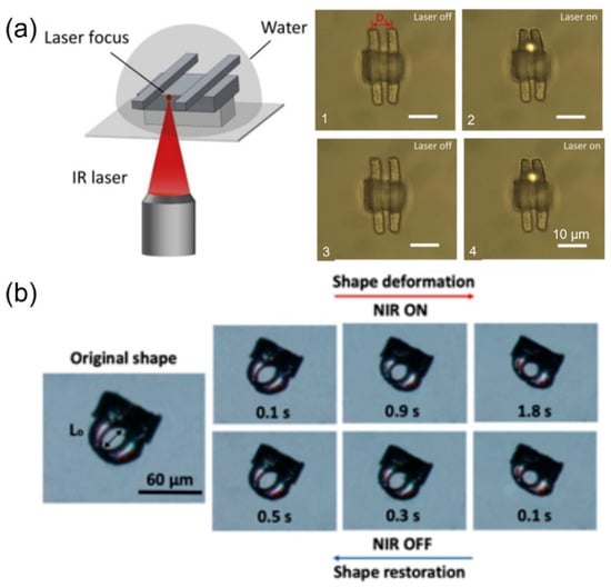 (a) Scheme and optical microscope photographs of the NIR laser-driven hydrogel microactuator. Reproduced with permission from [], Copyright © 2020 Elsevier. (b) The shape deformation and restoration of a light-controllable microgripper under NIR phase transition. Reproduced with permission from [], Copyright © 2019, American Chemical Society.