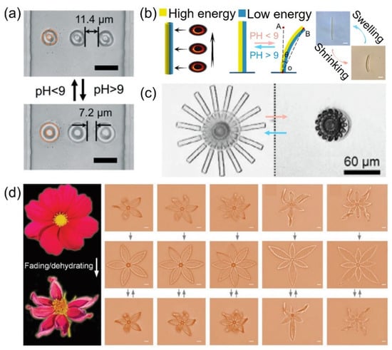 pH-responsive materials have drawn researchers’ attention because of their easy integration with microfluidics or liquid environments. For example, a pH-sensitive hydrogel composite could be regarded as an artificial musculoskeletal system for TPP printed microgrippers [].