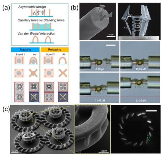 (a) Capillary-force-driven microactuator and its application for microparticle gripping. Reproduced with permission from [], Copyright ©2015, National Academy of Sciences. (b) Monolithic force-sensitive 3D microgripper fabricated on the tip of an optical fiber using two-photon polymerization. Reproduced with permission from [], Copyright © 2018 Wiley. (c) Bacteria-driven micromotor. Reproduced with permission from [], Copyright © 2017, the authors.