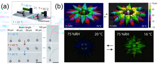 (a) 3D TPP pNIPAM-based hetero-microstructures for heat-driven microactuator and the temperature dependence of five structures with different beam lengths prepared under identical fabrication conditions. Scale bars are 20 µm and 50 µm. Reproduced with permission from [], Copyright © 2019, the authors. (b) 3D profiles and crossed polarized micrographs of the flower that depict indirect (triggered by heat) actuation. RH: relative humidity. Reproduced with permission from [], Copyright © 2020 American Chemical Society.